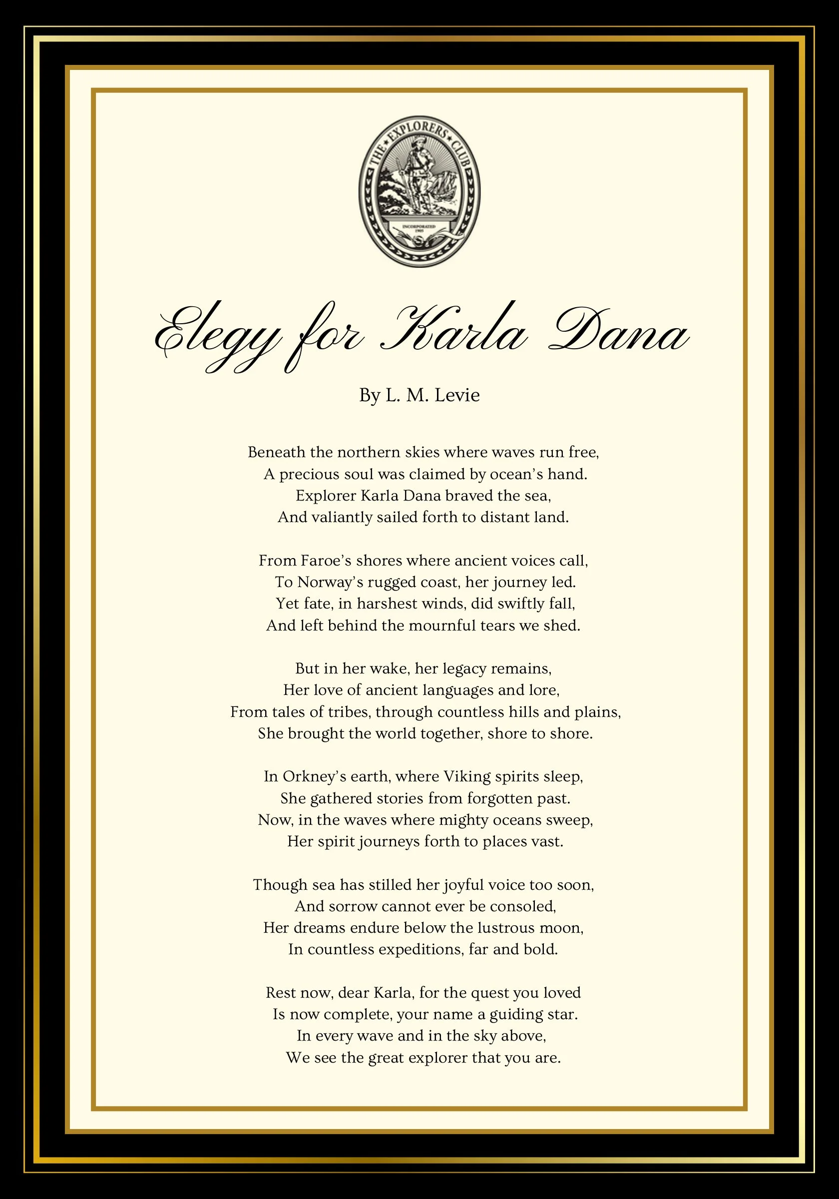 On a somber moment at the Awards Dinner, AIAC Chairman Levie addressed the club, noting “On August 30, we were heartbroken to learn that one of our newest members, Karla Dana, lost her life while on an expedition. She was part of a six-person international crew attempting to sail more than 500 nautical miles from The Faroe Islands to Norway in a replica of a Viking boat which tragically capsized in rough seas. Sadly, Karla was 29 years old.” He then recited the following poetic tribute which he had composed in her honor: