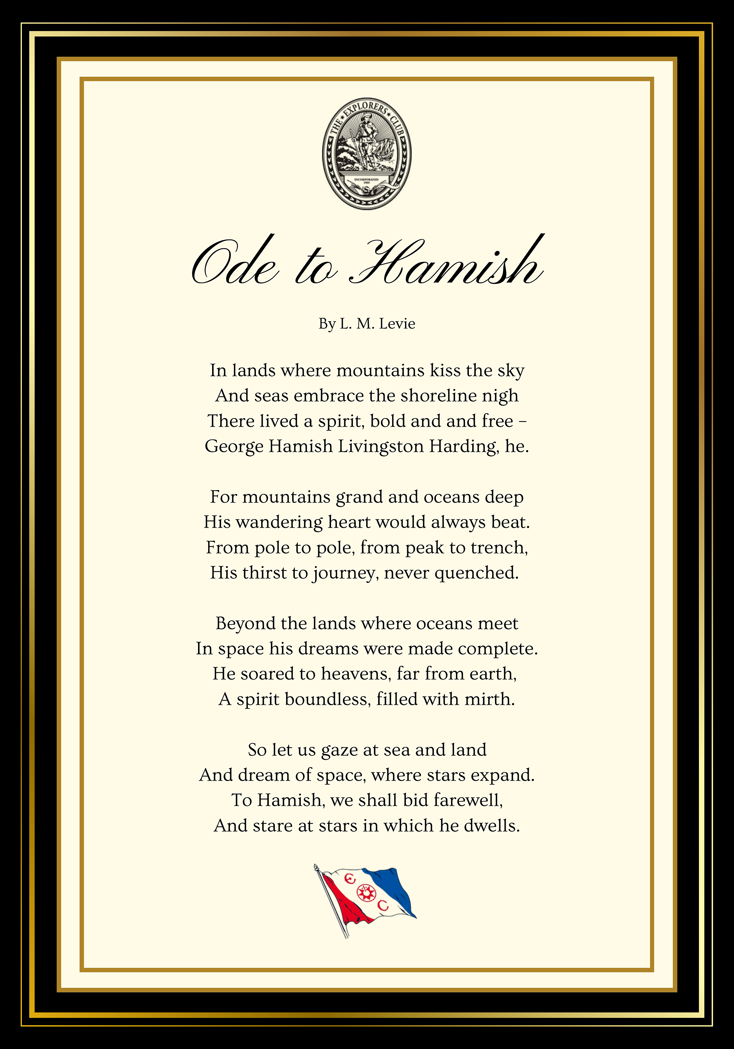 December 16, 2023 New York, NY AIAC Chairman L. M. Levie, Member of the Board of Trustees of the Explorers Club, joined with members, officers, directors, and trustees in paying somber tribute to Hamish Harding and Paul-Henri Nargeolet, at a memorial service held at the Explorers Club historic headquarters in New York. Harding and Nargeolet perished aboard the Titan submersible on June 19, near the site of the sunken Titanic. In lieu of personal recollections, at the service Mr. Levie recited the following elegy which he composed for his friend and fellow Trustee, Hamish Harding:
