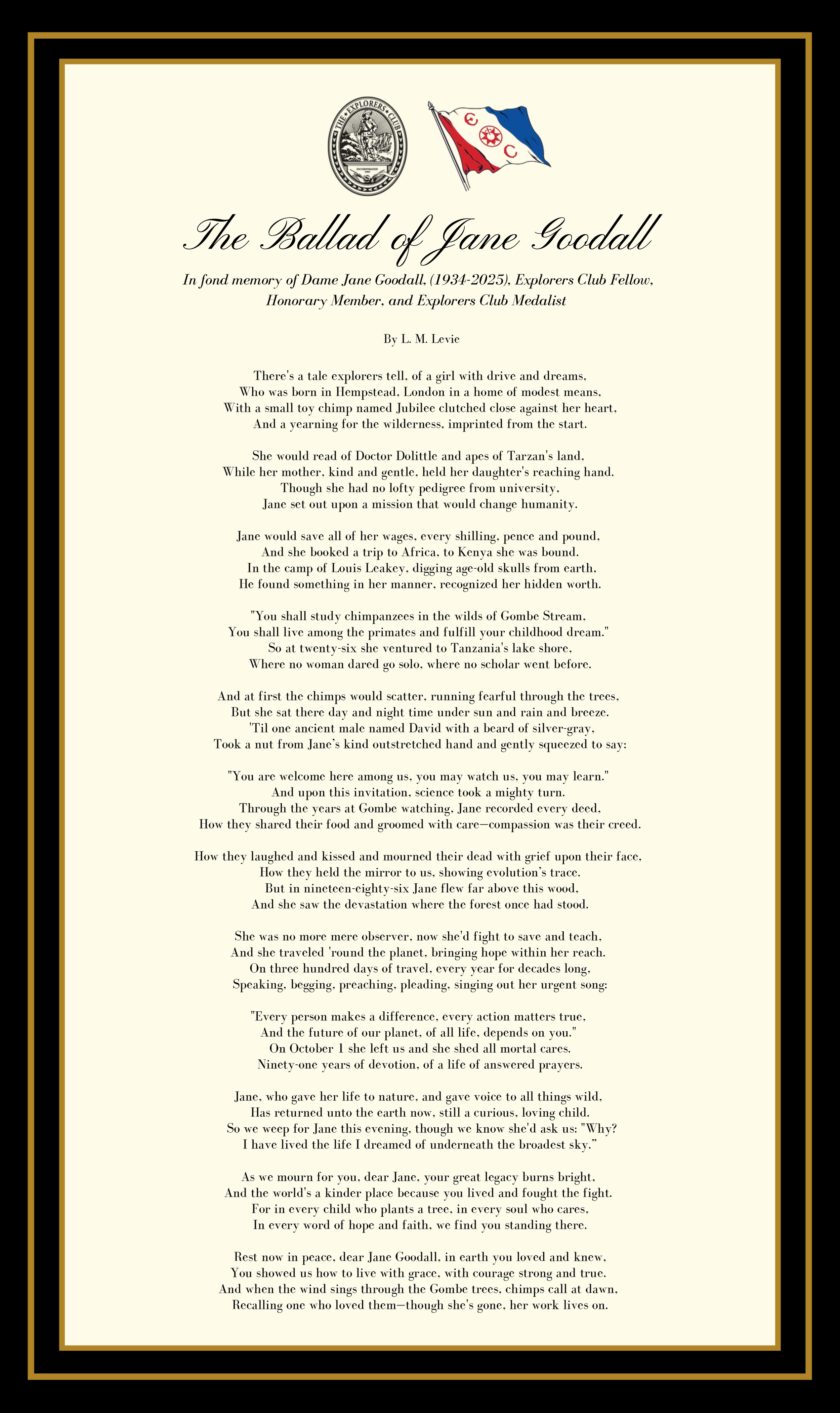 Mr. Levie, the Poet Laureate of the Explorers Club and a Member of the Circle of Hope of the Jane Goodall Institute, composed the following poetic tribute in honor of Dame Jane Goodall: