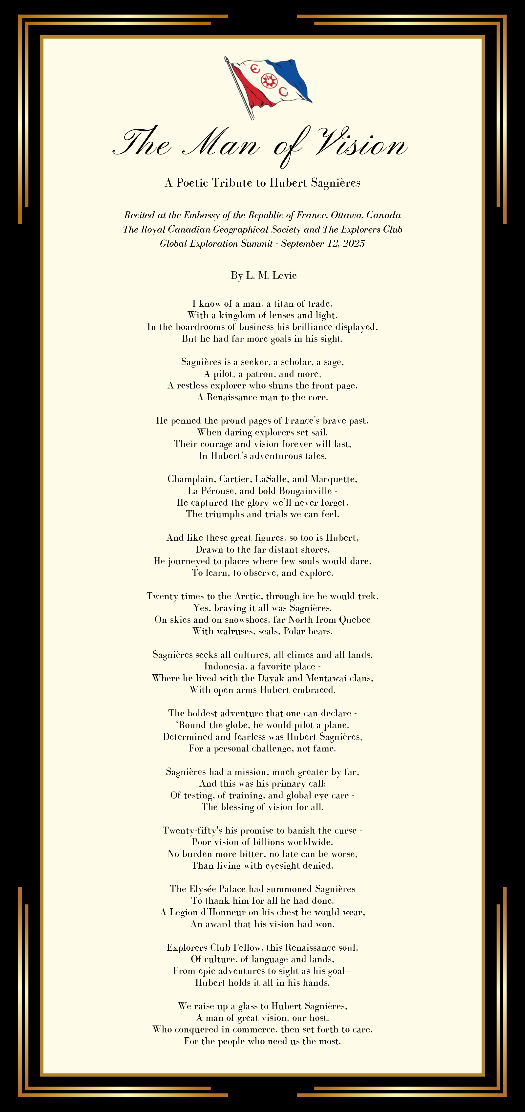 Ottawa, Ontario, Canada – September 12-14, 2025 — At the formal opening reception and ceremony for the Global Exploration Summit (GLEX), Explorers Club Fellow and noted corporate leader, aviator, arctic and tropical explorer, historian, and philanthropist Hubert Sagnières was honored with the recital of The Man of Vision, a poetic tribute composed by AIAC Chairman and Explorers Club Trustee L. M. Levie. Held at the French Embassy, the ceremony included the following dignitaries: