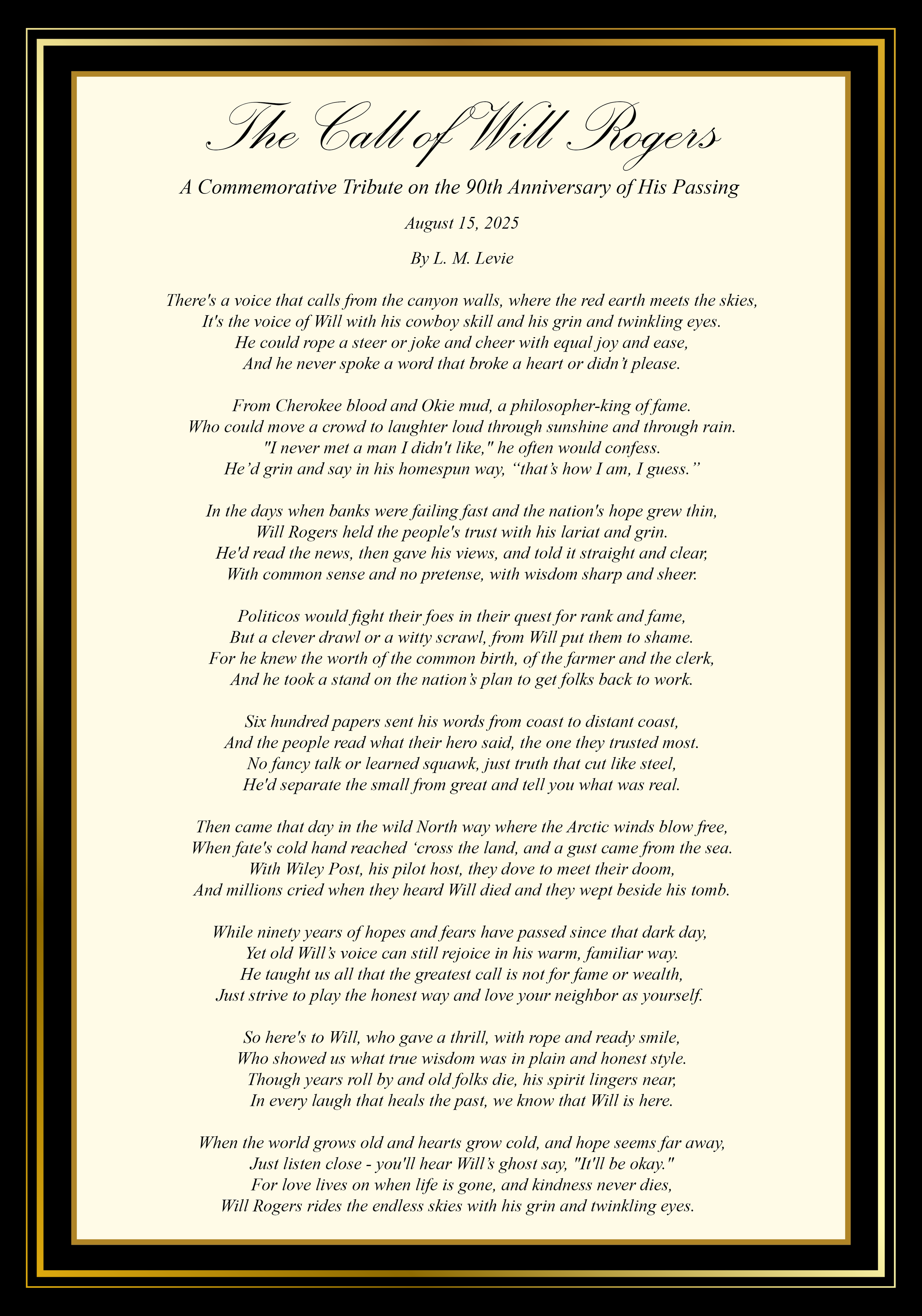 The solemn ceremony will take place at the Will Rogers family tomb on the museum grounds, where Rogers was laid to rest alongside his wife Betty and their children. The ceremony will include members of the Rogers family and a poetic elegy written by AIAC Chairman L. M. Levie, entitled The Call of Will Rogers, which shall be recited by Tad Jones, Executive Director of the Will Rogers Memorial Museum. The poem is found here: